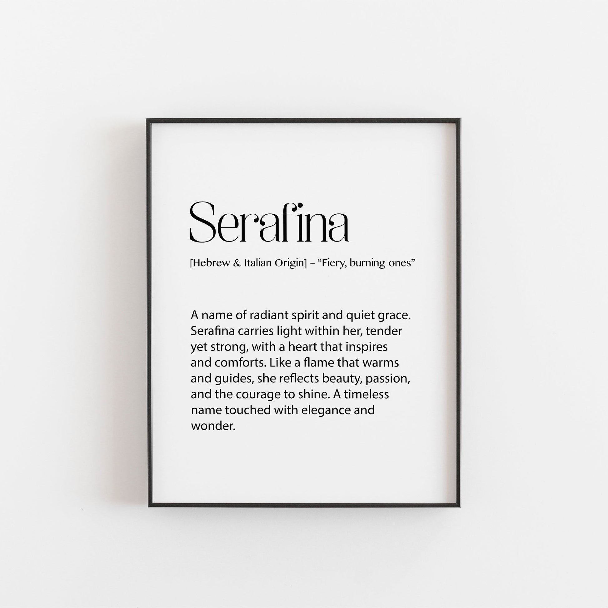 This elegant name print makes a thoughtful gift or a meaningful addition to any nursery, bedroom, or special space. A celebration of the name Serafina and the luminous qualities it represents.